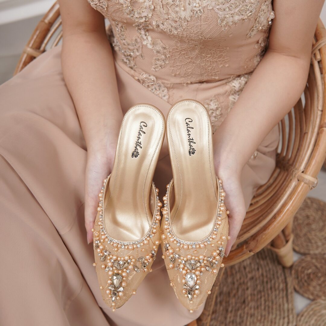 deu_calantha memperkenalkan sepatu keluaran baru: Sepatu Selop Payet Lynelle. Sepatu yang memiliki hak tebal ini terbuat dari kain brokat mewah yang dihiasi dengan manik-manik permata serta mutiara yang tersebar apik di bagian depan sepatu. Haknya yang tebal terbuat dari kulit sintetis dengan kualitas tinggi, sehingga tetap kuat meski termakan oleh waktu.